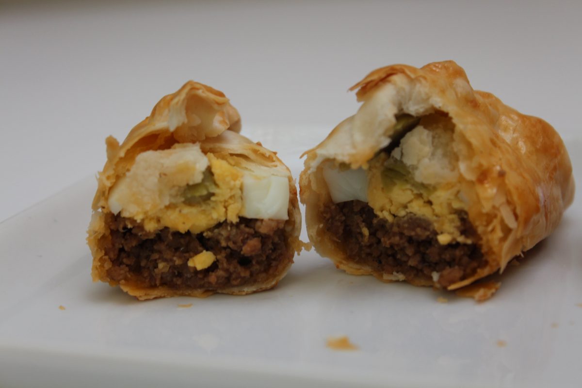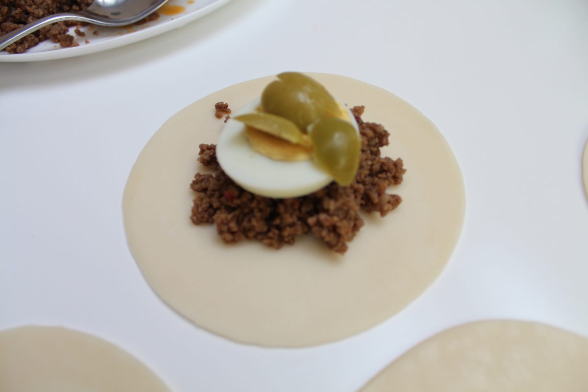 - במרכז כל עיגול שמים כף נדיבה של בשר טחון ומעליה רבע ביצה קשה וזית אחד.