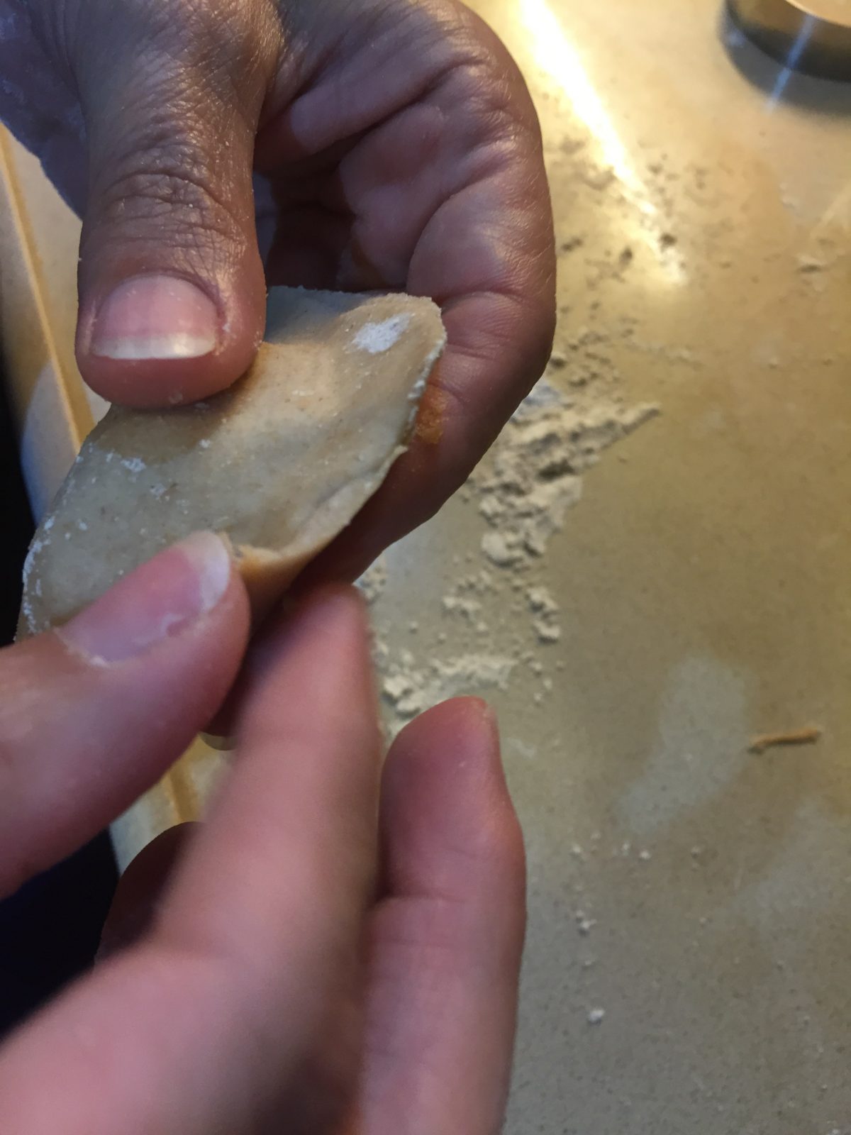 ממלאים קצת מים בצלוחית קטנה. - מקמחים את משטח העבודה ומרדדים את הבצק לעובי של כ 2 מ"מ.