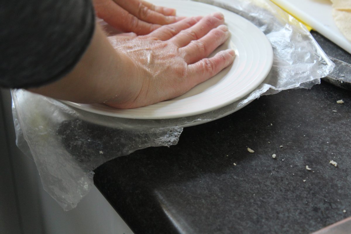 לוקחים שתי צלחות גדולות ושטוחות, מערוך ושתי שקיות ניילון קשיחות יחסית כמו שמרדף (לורנה עבדה עם ניילון ואני ניסיתי בבית עם נייר אפיה אבל נייר האפיה מקמט את הבצק וגם נקרע לעיתים קרובות אז עדיף עם שקיות ניילון)