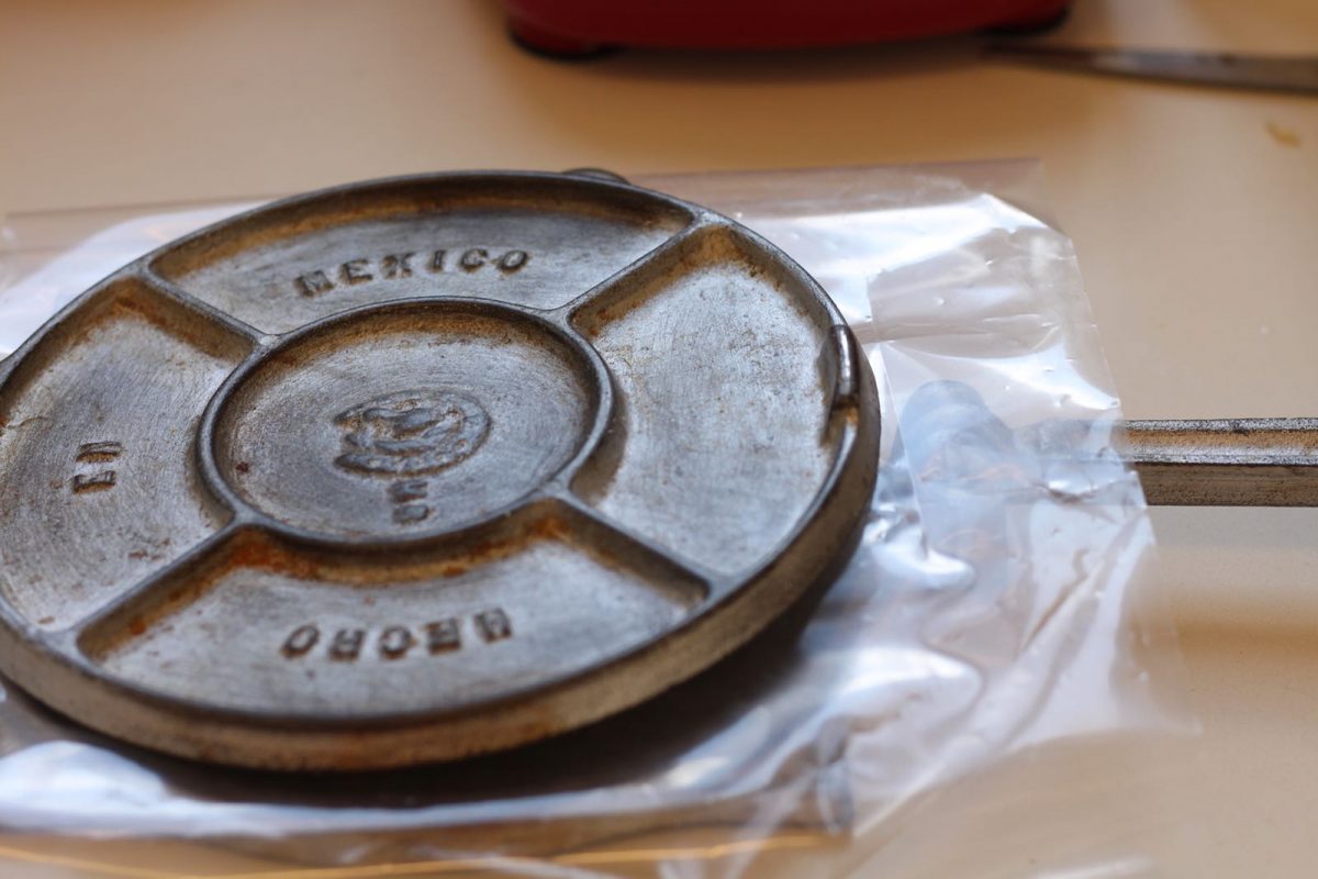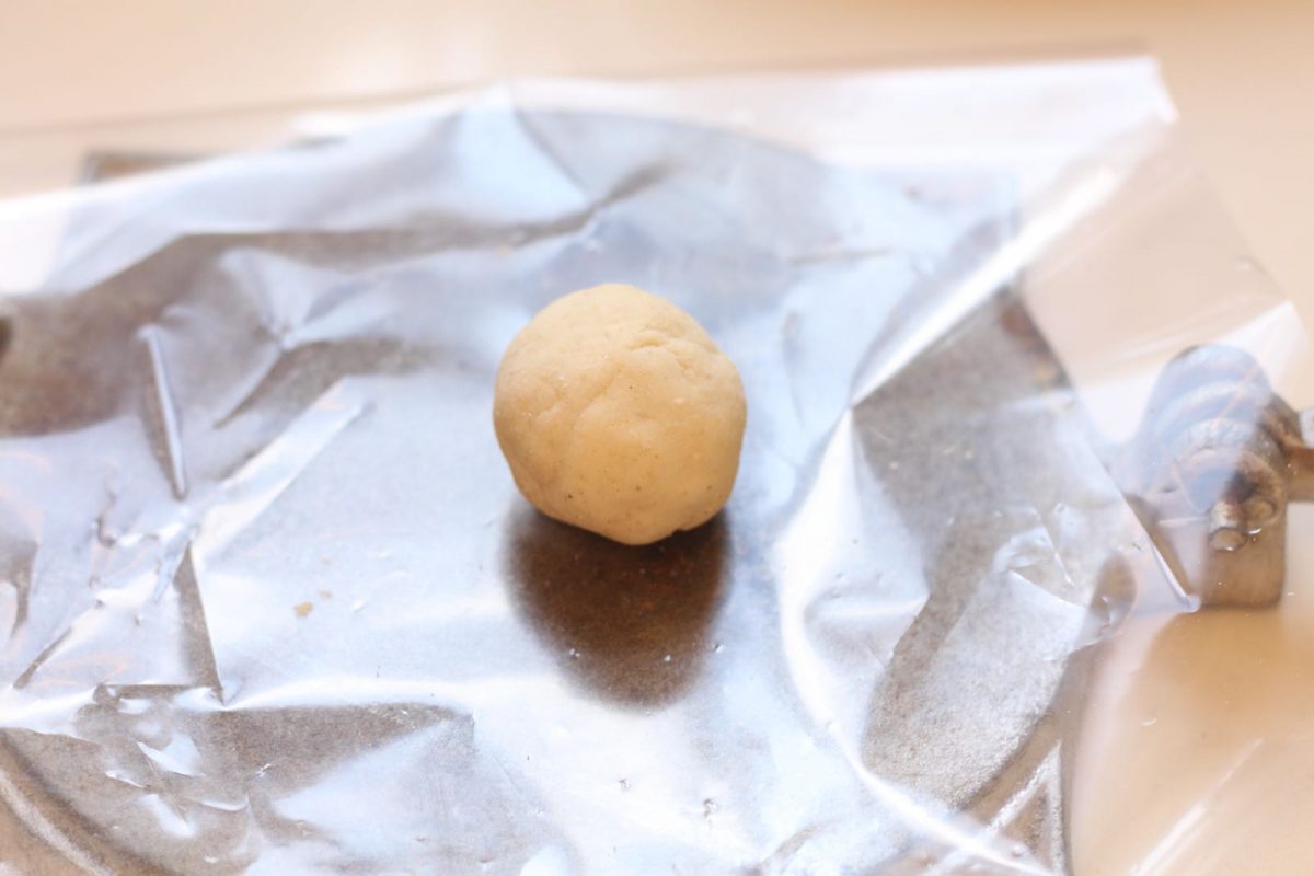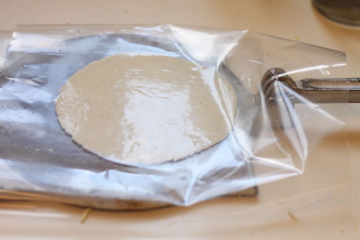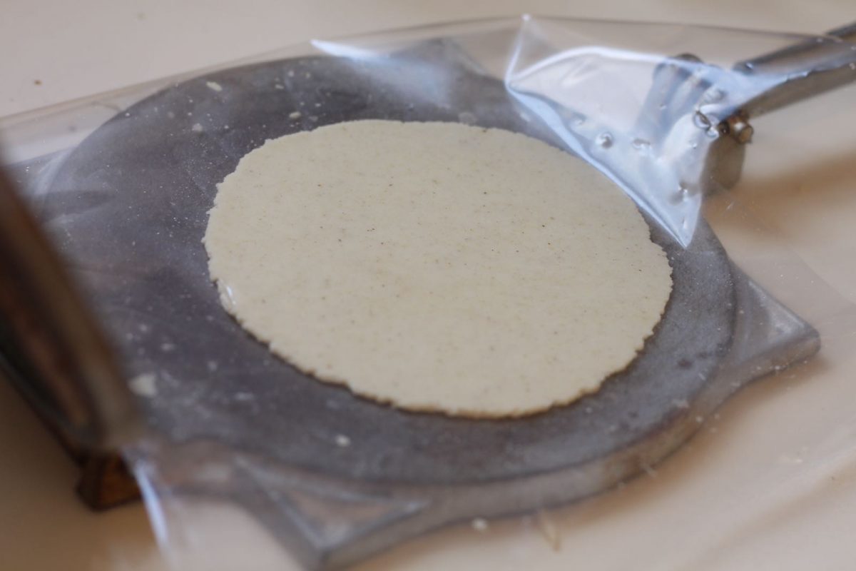 5. מניחים ניילון על המכשיר להכנת טורטיה, מניחים את כדור הבצק, מכסים בעוד ניילון ו״מגהצים״ את הכדור